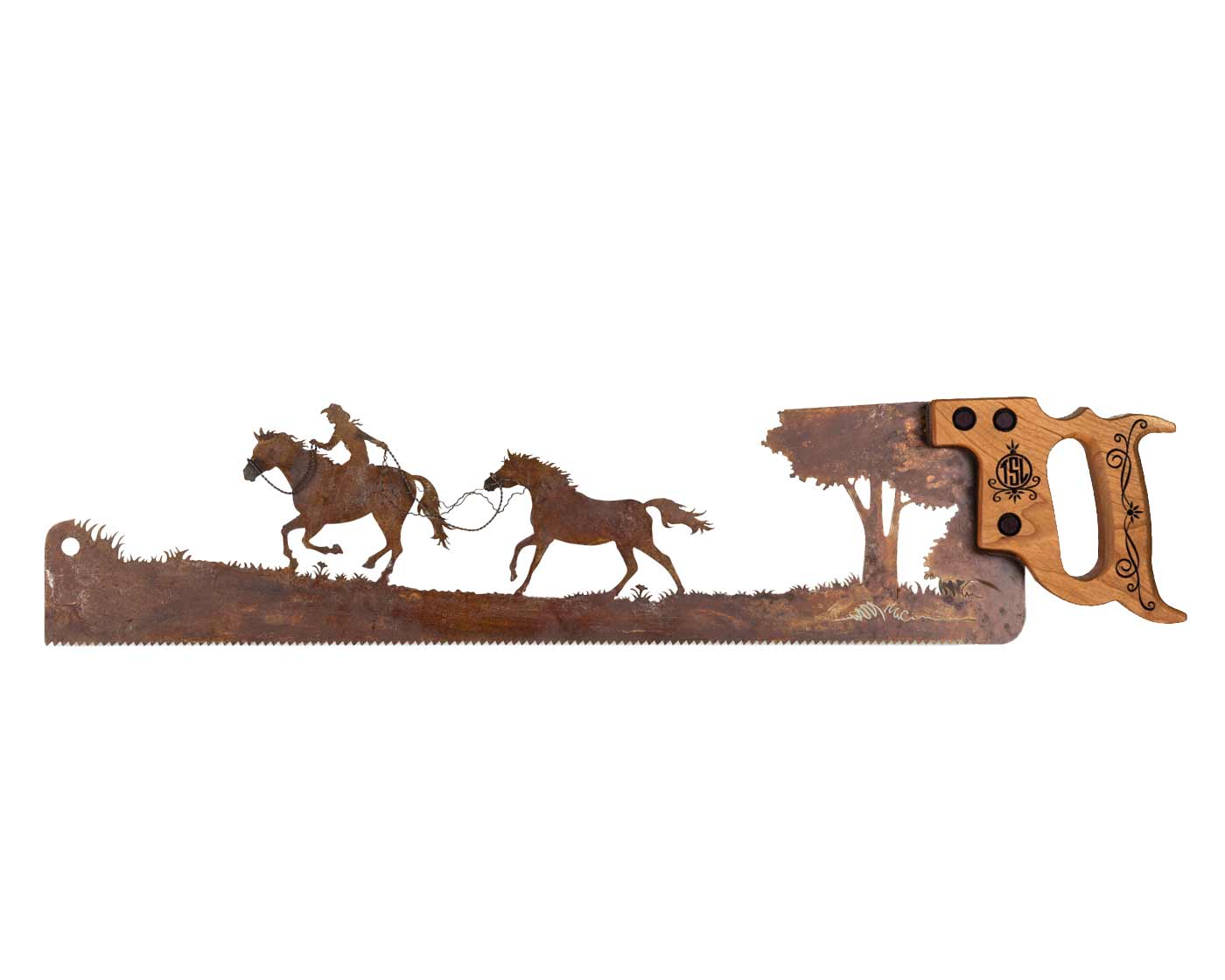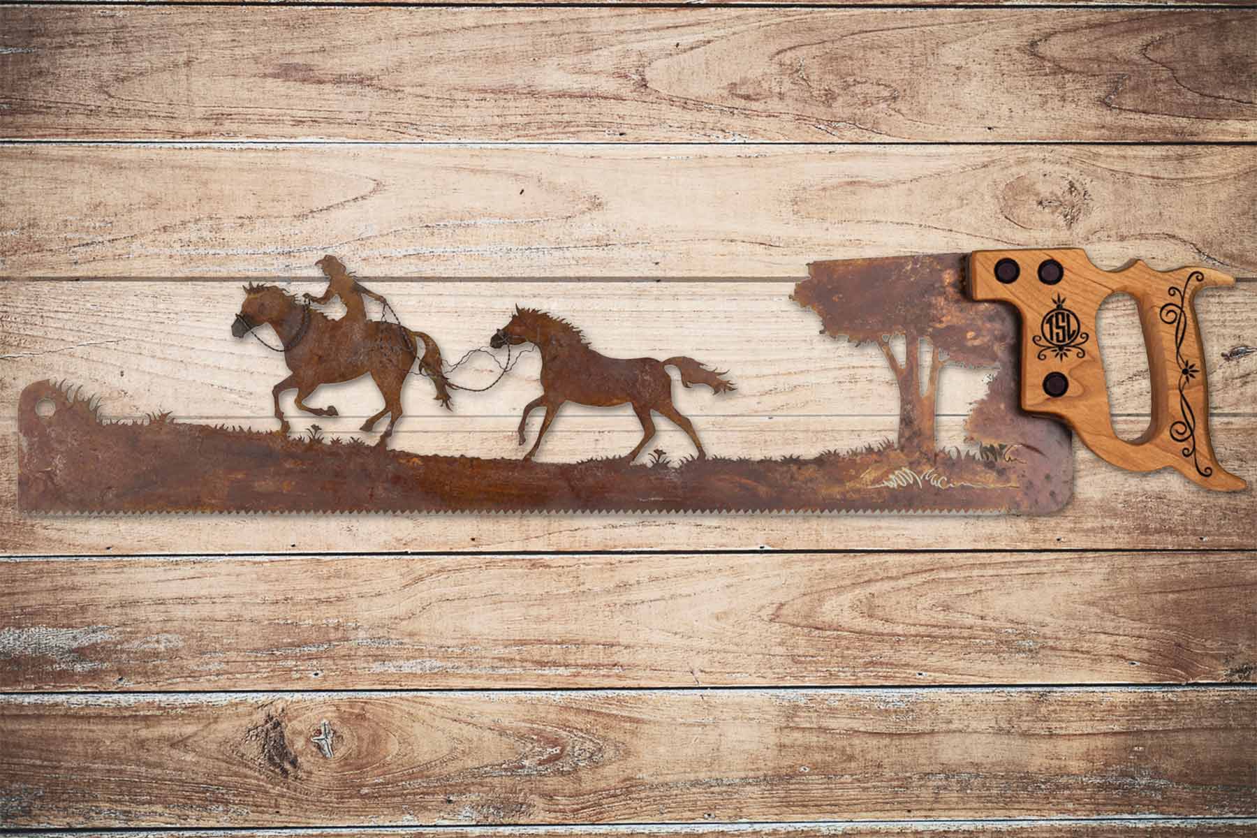 This saw captures a cowboy slipping away on horseback, telling a classic Western story of grit, risk, and frontier justice. A bold piece of rustic wall art, it makes a memorable gift for Western art lovers, ranchers, and anyone drawn to cowboy culture (~30″ long).
