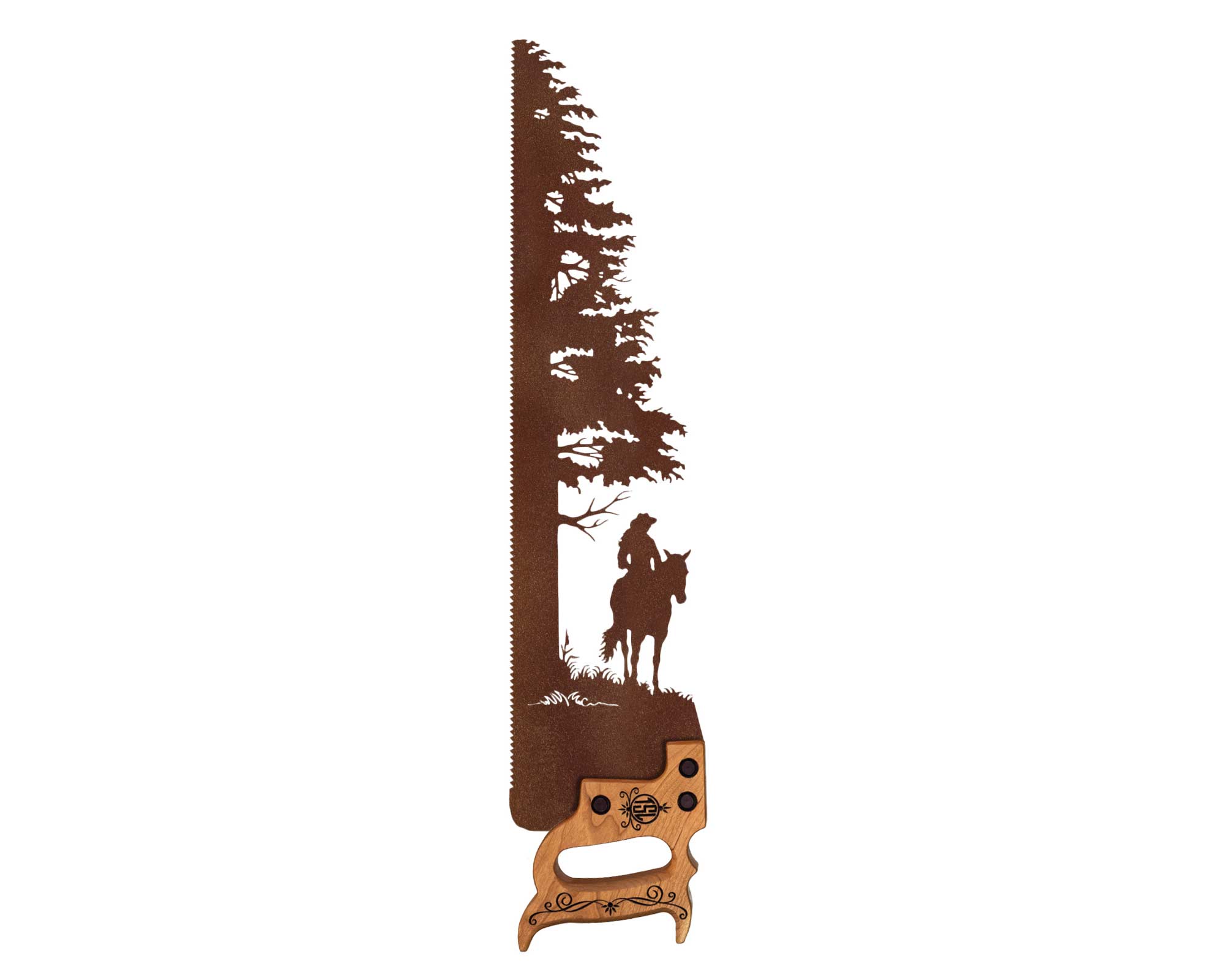This unique metal wall art FEATURING A COWGIRL RIDING HER HORSE NEXT TO A TREE is a great gift for friend or yourself! The perfect metal saw art gift will look great on your wall!