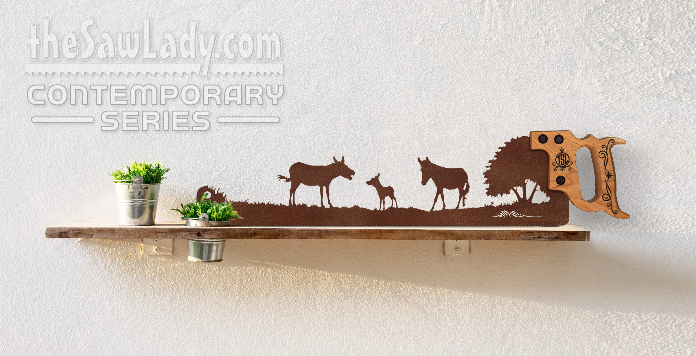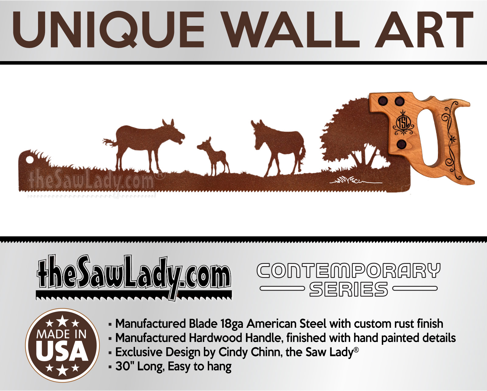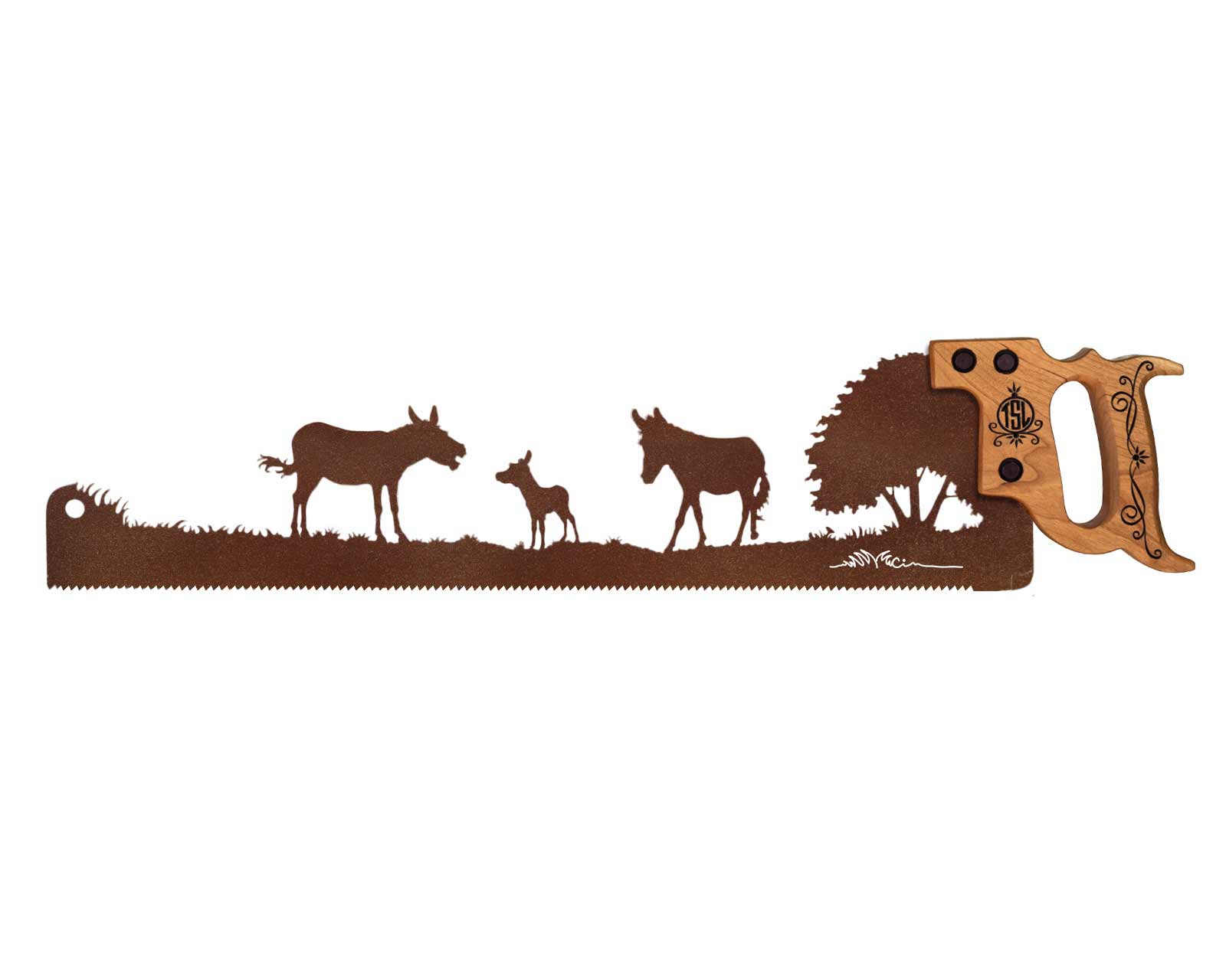 This unique metal wall art FEATURING DONKEYS IN A FIELD is a great gift for a friend or yourself! The perfect metal saw art gift for the rancher or farmer in your life!