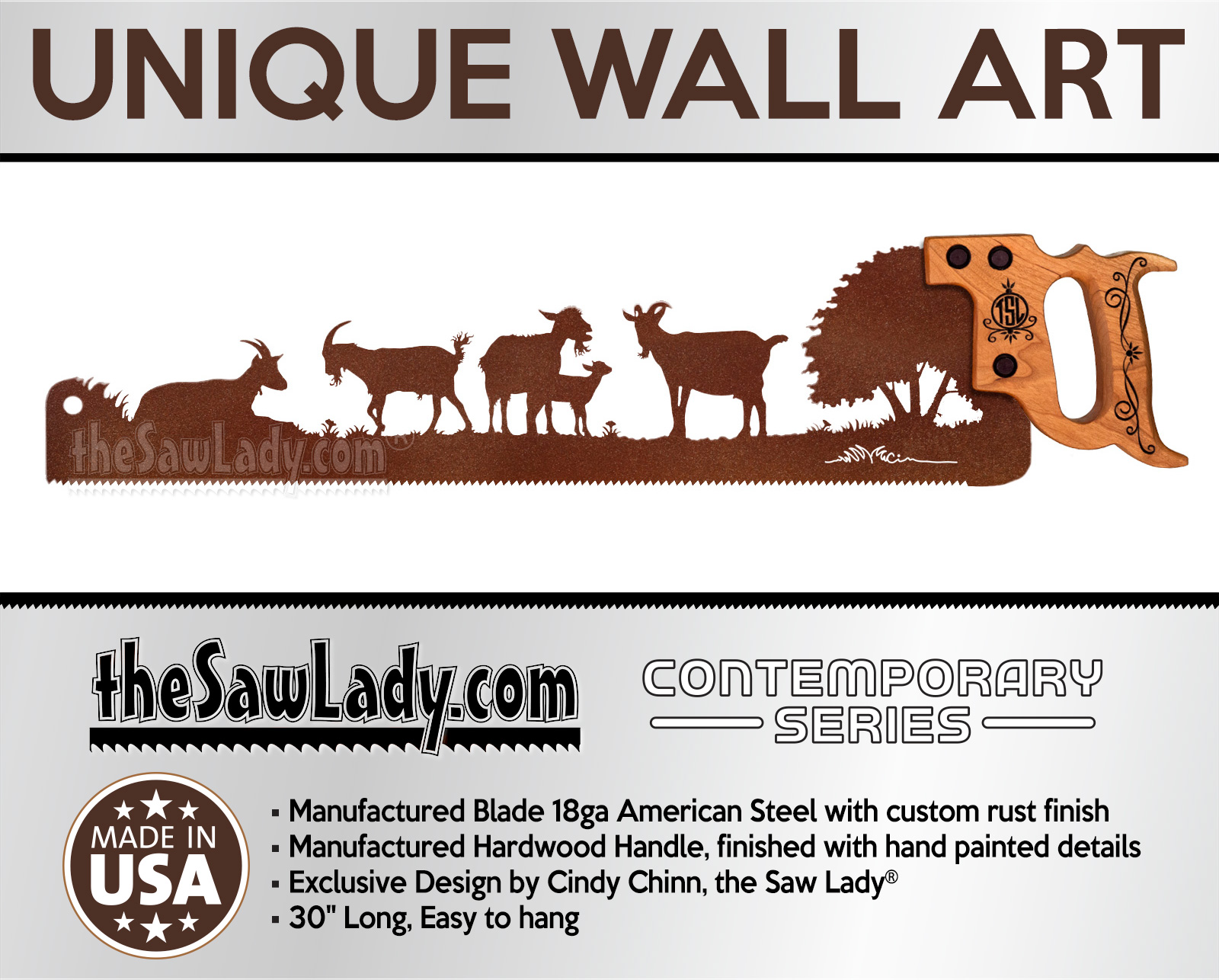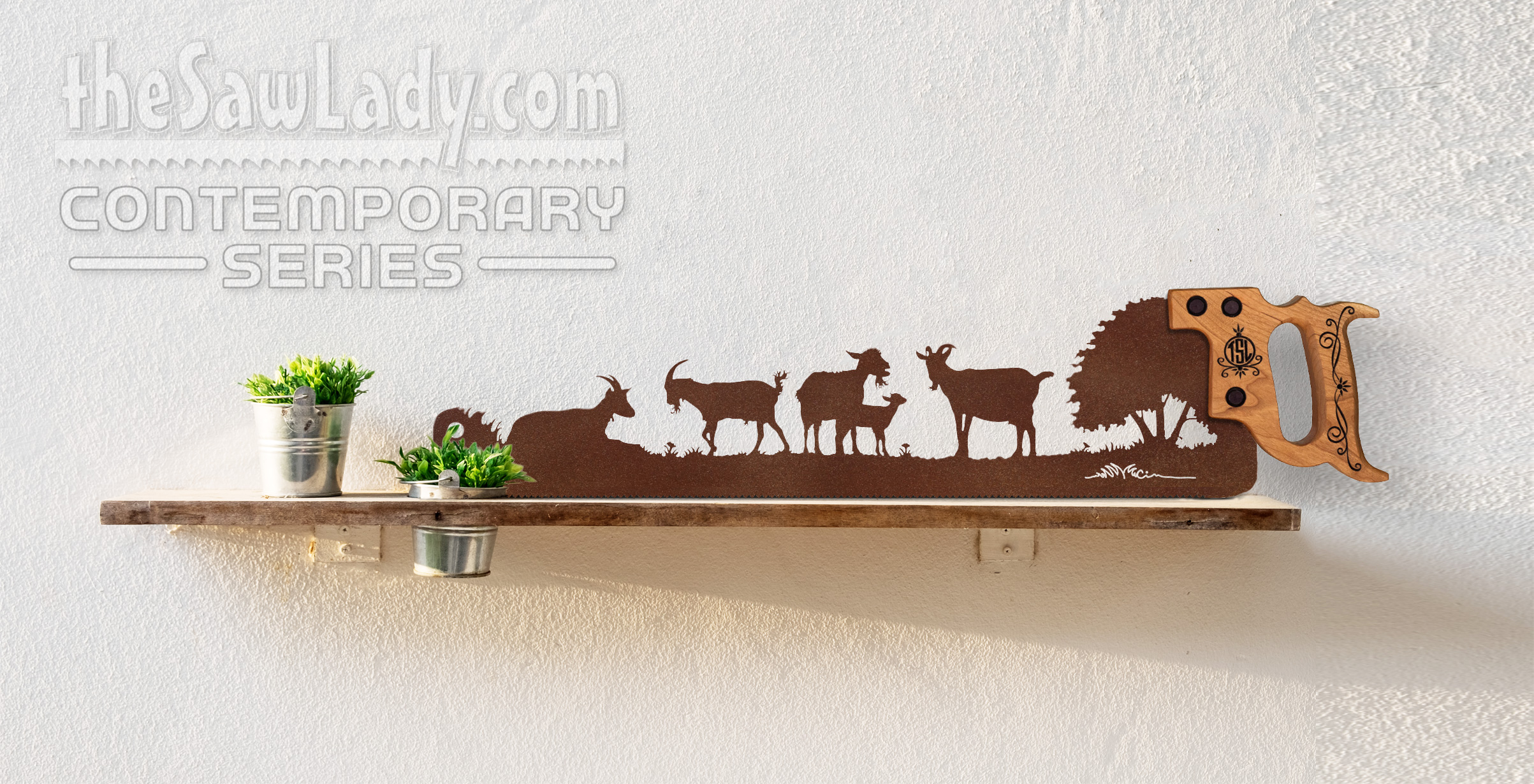 This item is part of my Contemporary Series, which is assembled from new materials and then handcrafted specifically for a great rustic look.  Unlike the ‘Vintage Series’, which is created from repurposed vintage hand saws, the Contemporary Series uses my original designs and manufactured pieces to create a unique line of saw art.