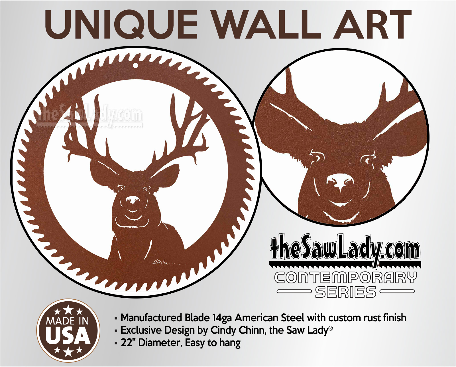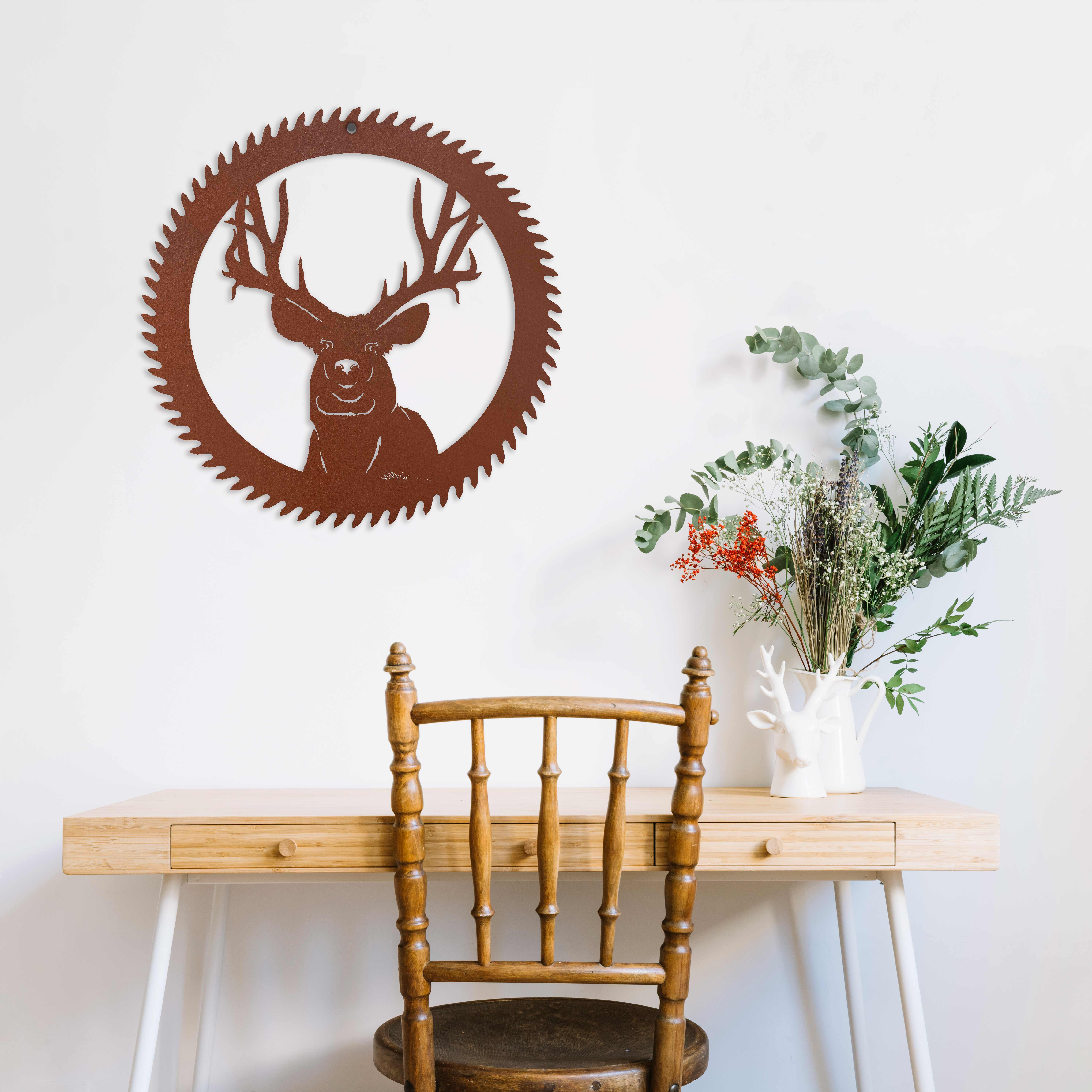 This powerful buck design brings the spirit of the outdoors right into your home. The wide antlers and confident stance are precision cut into a 22-inch round steel saw blade, creating a bold focal point that stands out in any rustic setting.