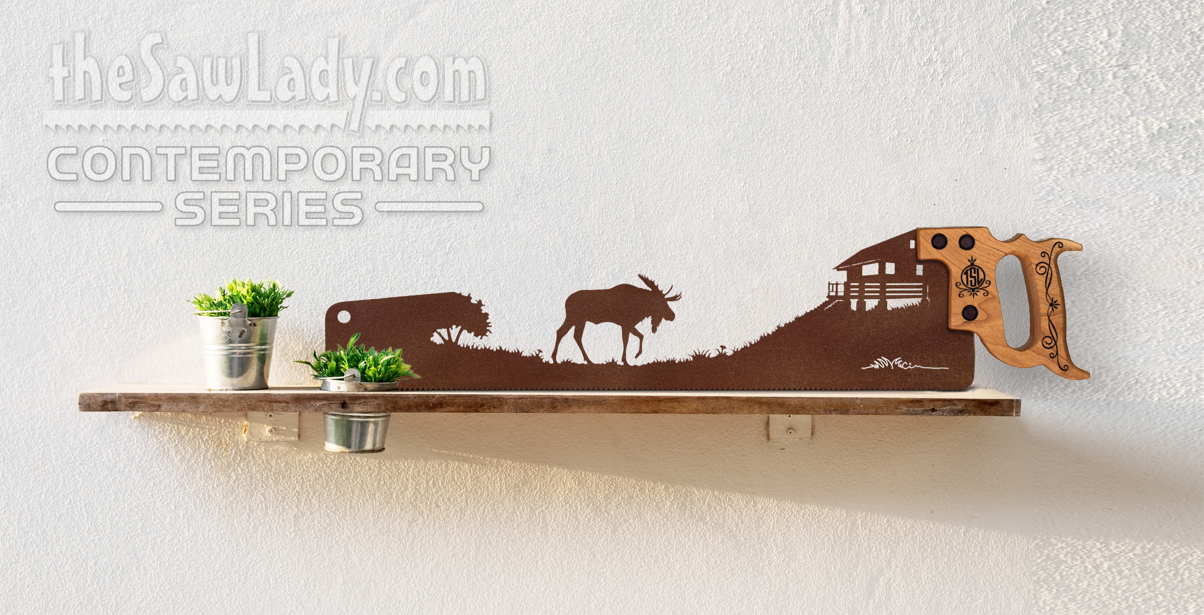 This saw depicts a majestic moose beside a cozy cabin, capturing the spirit of wildlife in a serene outdoor setting. It makes a meaningful gift for nature lovers, outdoor enthusiasts, and anyone who enjoys rustic or cabin-style décor, 30 inches long.