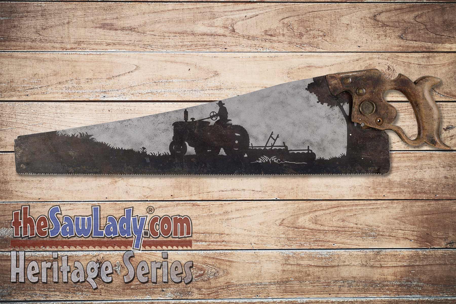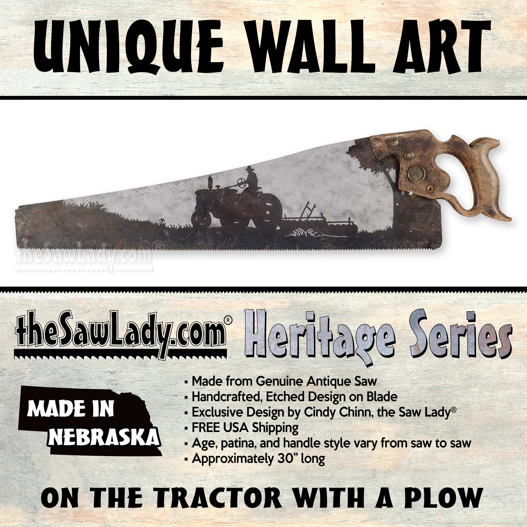 Bring a piece of history into your home with this unique work of art from my Heritage Series. Each saw in this collection began its life as a real working tool, often decades old, shaped by years of honest labor and weathered character. I personally select every vintage saw for its shape, patina, and personality, and then carefully etch one of my classic designs into the steel using a custom design process in my Nebraska studio.