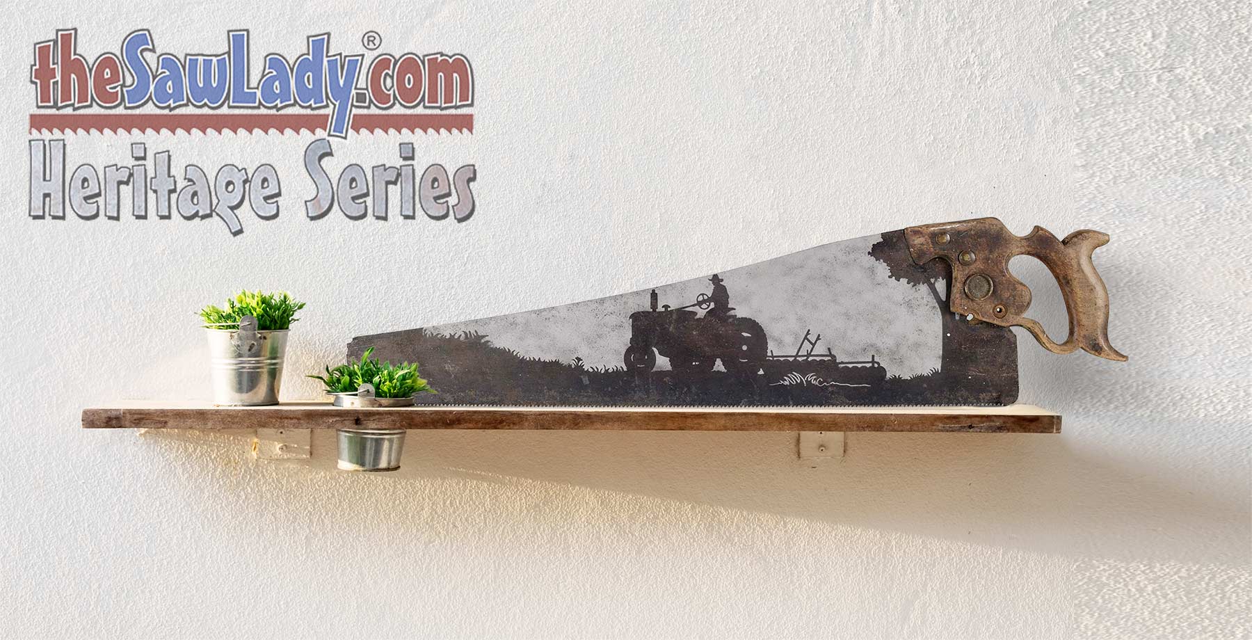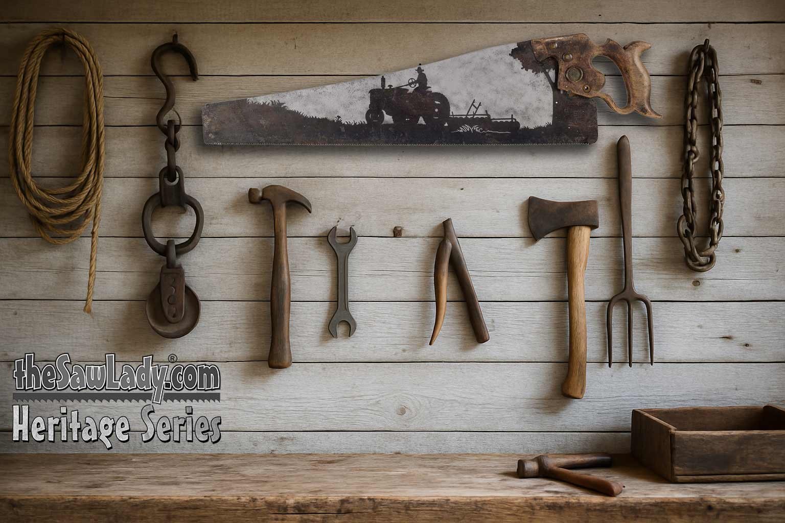 This collection bridges the gap between my fully hand-cut Vintage Series and my modern Contemporary Series. The Heritage Series offers real old tools paired with classic etched designs at an accessible price — perfect for art lovers, gift buyers, and anyone who wants a piece of rustic history on their wall. – LEARN MORE about my 3 series of Saw Art
