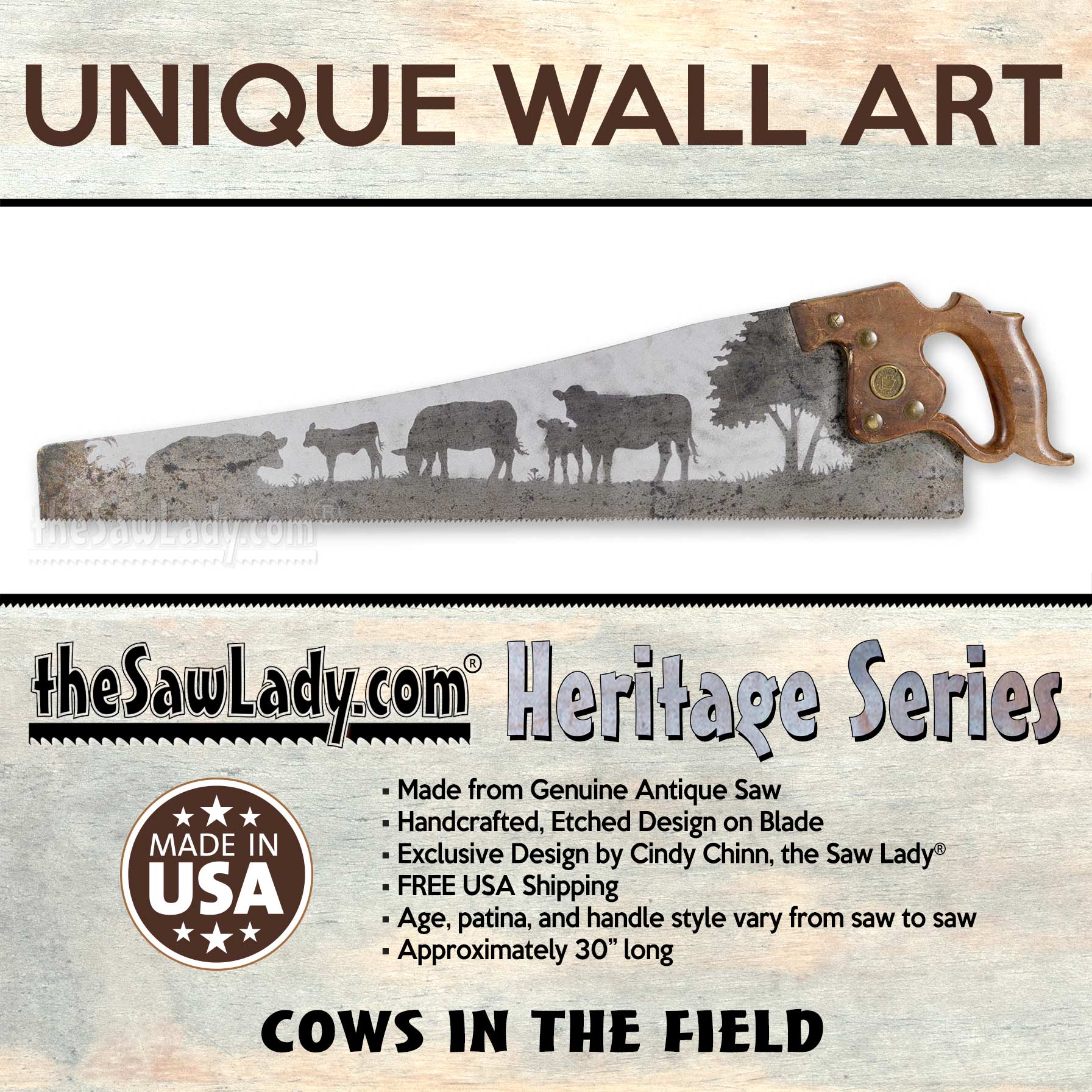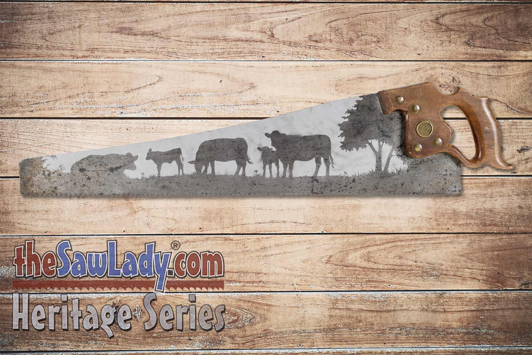 Bring a piece of history into your home with this unique work of art from my Heritage Series. Each saw in this collection began its life as a real working tool, often decades old, shaped by years of honest labor and weathered character. I personally select every vintage saw for its shape, patina, and personality, and then carefully etch one of my classic designs into the steel using a custom design process in my Nebraska studio.