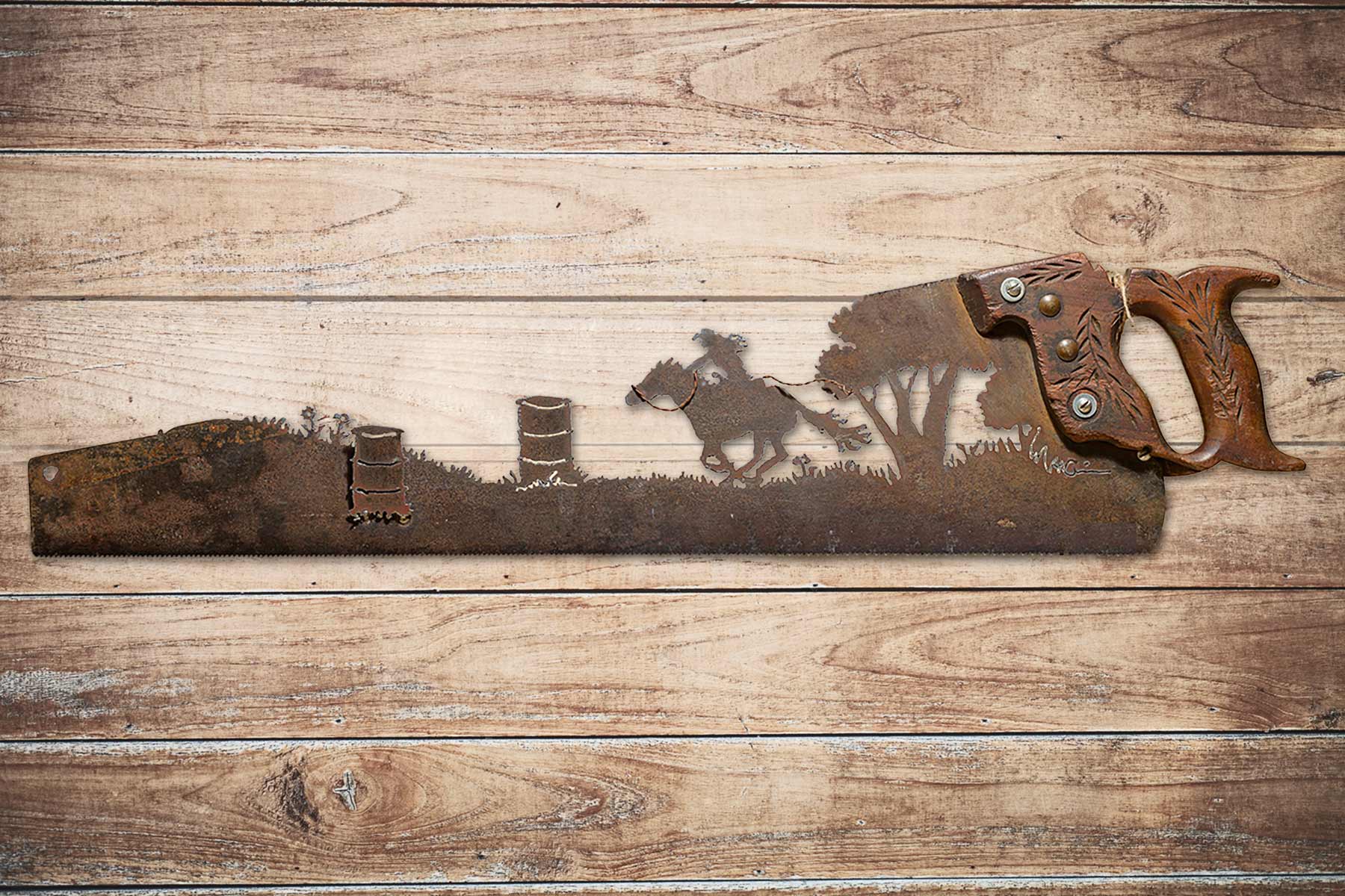 This vintage hand saw features a barrel racer in full stride, capturing the speed, precision, and determination of rodeo competition. Hand cut with a plasma torch and preserved with the saw’s natural patina, it’s a bold piece of rustic metal wall art for horse riders, rodeo families, or meaningful Western gifts. (~30 inches long)
