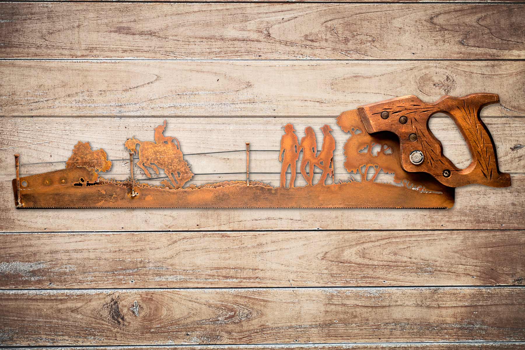 This handsaw FEATURING BRONCO BUSTING AT THE RODEO WITH SPECTATORS AND FENCE is a great, unique gift for friend or yourself! Perfect metal art gift for the western fan in your life! Also check out the Bull Rider Saw!