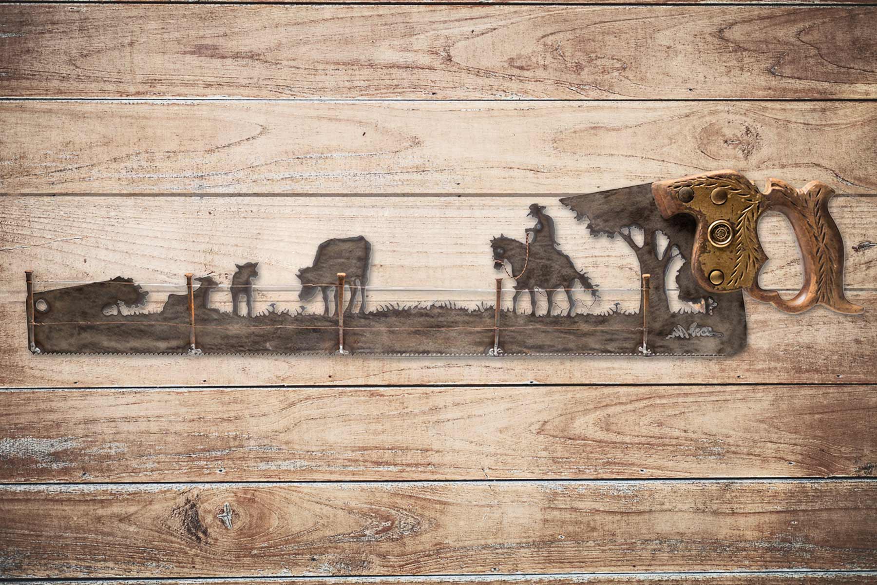 This handsaw featuring COWS, ALONG WITH A COWBOY AND HORSE – WITH A HANDMADE FENCE and is a great, unique gift for friend or yourself! Perfect metal art gift for the rancher in your life!
