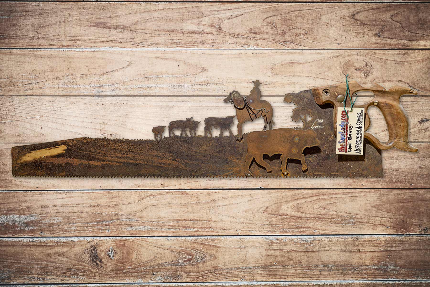 This handsaw with a cowboy / rancher out on the open range is a great, unique gift for friend or yourself! Perfect metal art gift for the rancher or horse lover in your life!